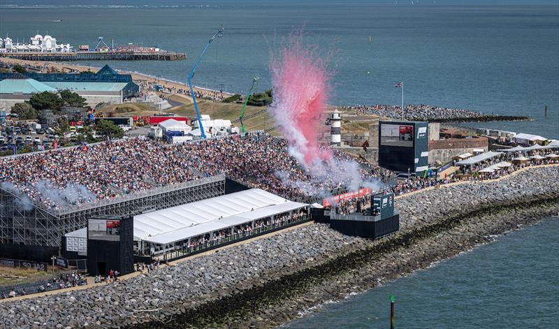 Pyrotechnics are fired on the stage opposite the SailGP Grandstand ahead of racing on Race Day 2 of the Emirates Great Britain Sail Grand Prix in Portsmouth, UK © Simon Bruty for SailGP
